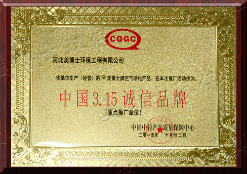 公司因其生產(chǎn)經(jīng)營的美博士牌空氣凈化產(chǎn)品被中國中輕產(chǎn)品質(zhì)量保障中心于二零一五年十月二十二日評為中國3·15誠信品牌。美博士環(huán)保會繼續(xù)以其實實在在的產(chǎn)品質(zhì)量,為國民造福。