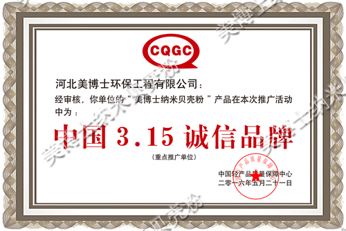 美博士“美博士納米貝殼粉”在推廣活動中經(jīng)中國輕產(chǎn)品質(zhì)量保障中心審核通過,于2016年5月21日評為中國3·15誠信品牌。